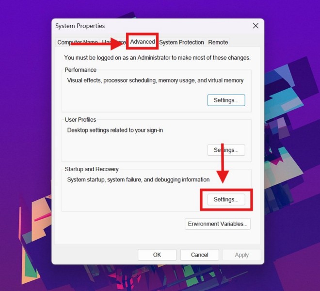 3.W następnym oknie przejdź doZakładka Zaawansowanei kliknijPrzycisk UstawieniapodSekcja Uruchamianie i odzyskiwanie.