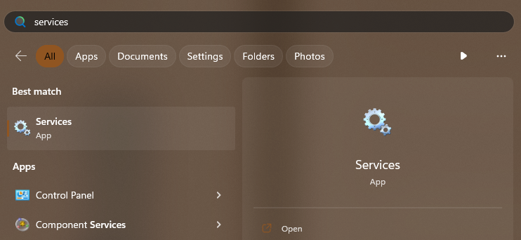 1.OtwórzStartmenu, wpiszUsługina pasku wyszukiwania i naciśnijWchodzićklawisz z klawiatury.