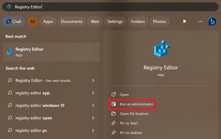 1.NaciśnijWygraćklucz do otwarciaMenu startowe. WyszukajEdytor rejestrui kliknijUruchom jako administratorprzycisk.