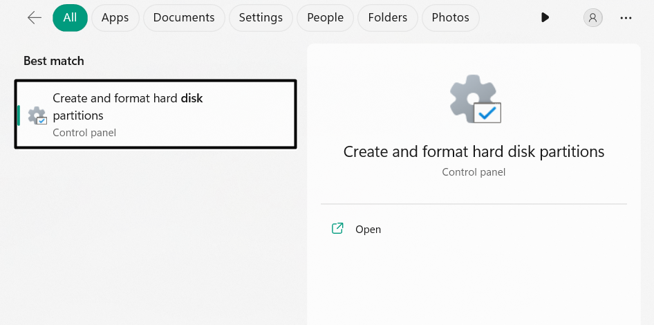 1.OtwórzPole wyszukiwania systemu Windows, typZarządzanie dyskamii otwórz aplikację na swoim komputerze.
