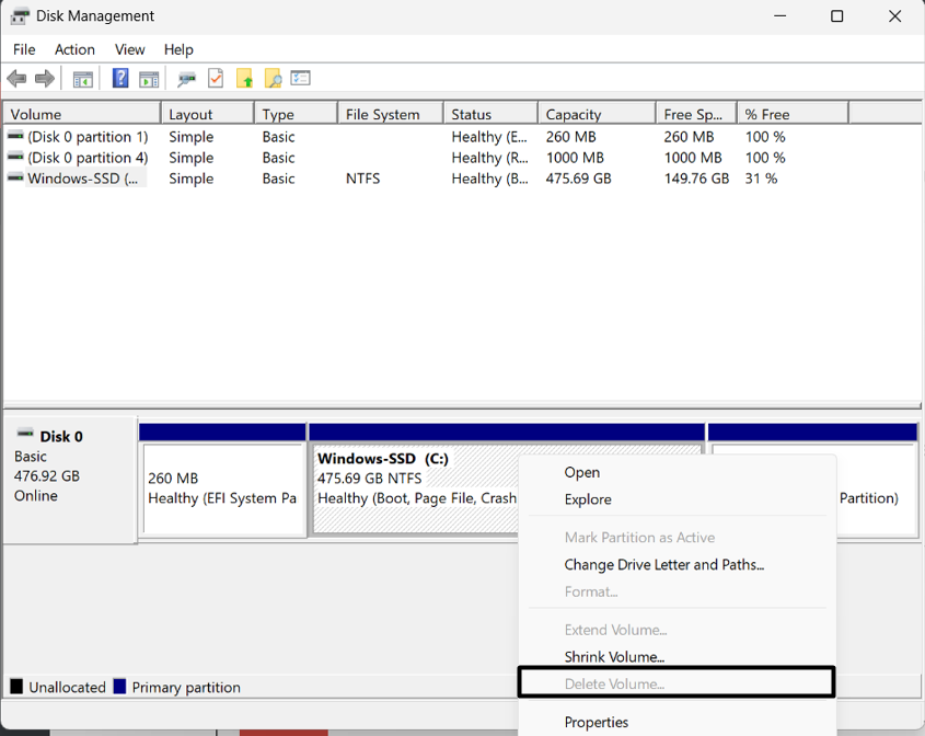 Innym sposobem naprawienia wyszarzonej opcji Rozszerz głośność w systemie Windows 11 jestusuń wolumin w programie Zarządzanie dyskami. Spowoduje to usunięcie dysku z komputera z systemem Windows 11.