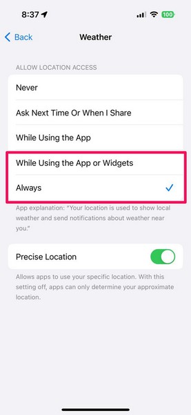 7.W przypadku niektórych aplikacji, takich jakAplikacja pogodowa, zrobisz toznajdź dodatkowe opcjejak na przykładZawszeIPodczas korzystania z aplikacji lub widżetów.