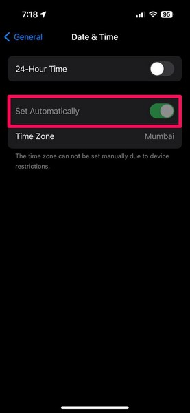 4.Tutaj upewnij się, że przełącznik dlaUstaw automatycznieopcja jest włączona na Twoim urządzeniu.
