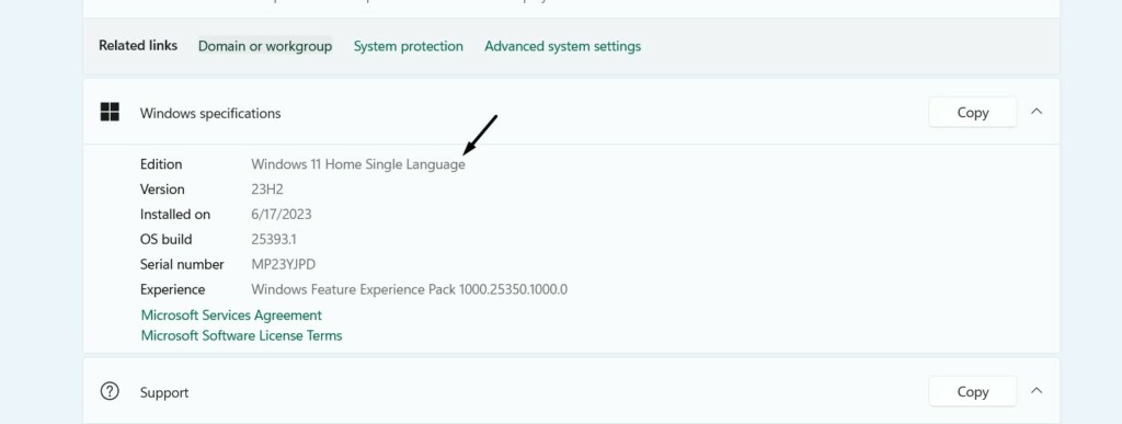 2.Na następnym ekranie rozwińSpecyfikacje Windowsasekcję i sprawdź wersję systemu Windows.