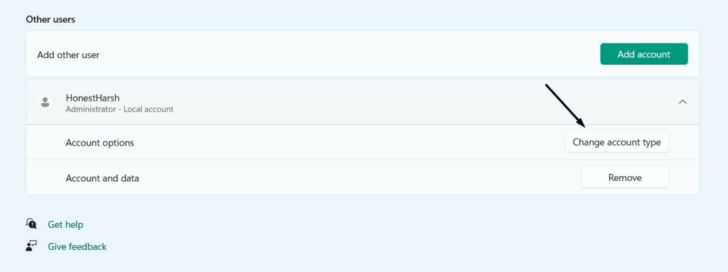 3.Jeśli widziszAdministratorpod Twoim kontem użytkownika, oznacza to, że ma już uprawnienia administratora. Jeśli nie widzisz czegoś takiego, kliknijZmień typ kontaprzycisk.