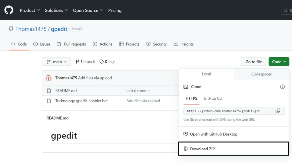 3.Kliknijgpedit-main.zipplik, a następnie kliknij dwukrotnie plikTricknologia gpedit-enabler.batw nim plik.