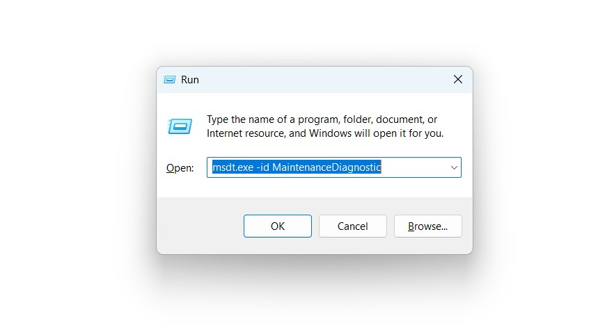 2.Wpisz w nim msdt.exe -id MaintenanceDiagnostic, aby otworzyć plikKonserwacja systemunarzędzie do rozwiązywania problemów.