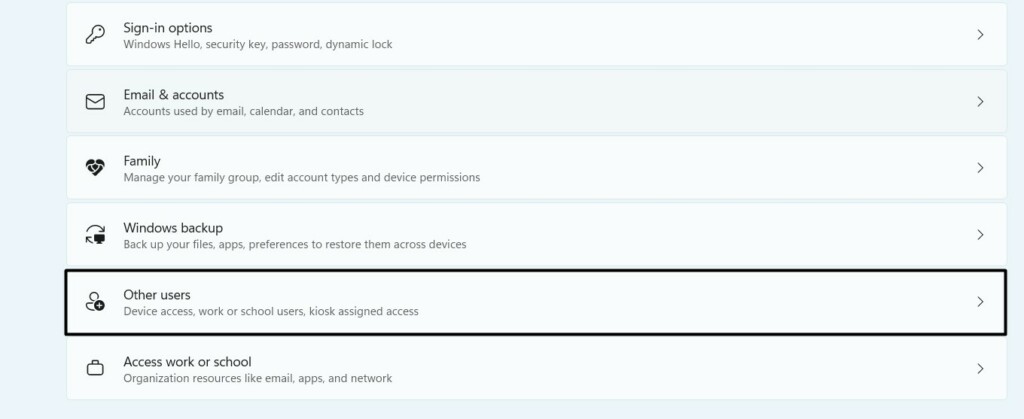 2.Kliknij naInni użytkownicyopcję w następnym oknie i kliknij przyciskDodaj kontoprzycisk.