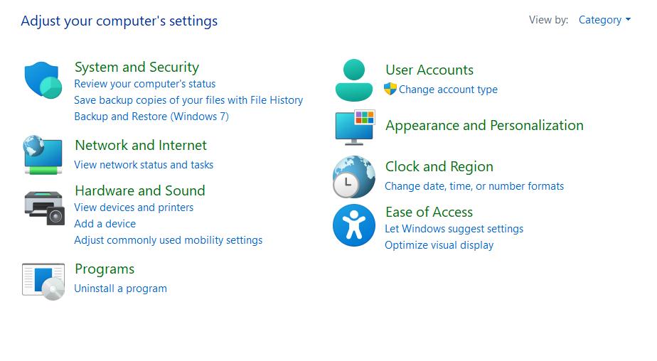 Krok 3:Otworzy się teraz okno Panelu sterowania. Musisz kliknąć opcję Wyświetl według na górze i wybrać Kategoria z menu rozwijanego.