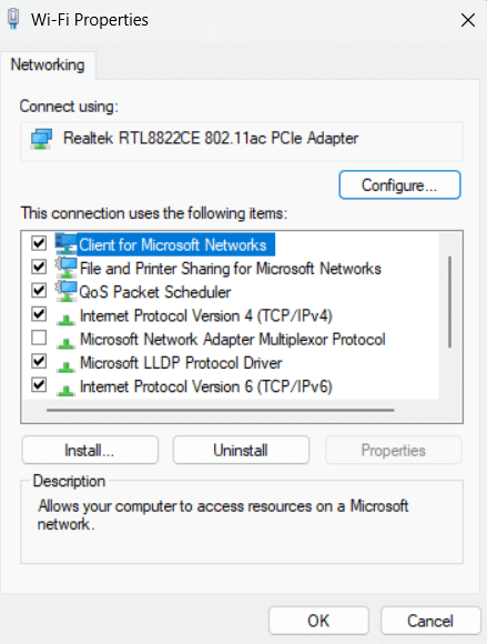 Krok 2:TheWłaściwości sieciokno pojawi się teraz na ekranie. Kliknij prawym przyciskiem myszy połączenie internetowe i wybierz „Właściwości”.