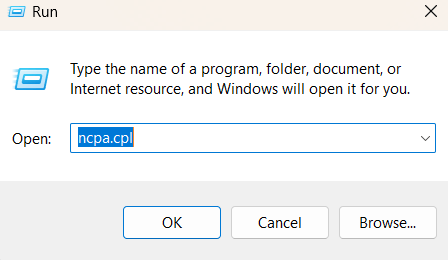 Krok 1:NaciśnijWygraj + Rkombinacja klawiszy, aby otworzyćUruchomićokno dialogowe. Typ "Ncpa.cpl” w polu tekstowym i naciśnijWchodzić.
