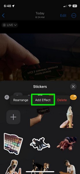 4.Kiedy naklejka zostanie dodana do listy naklejek,dotknij i zwolnij, aby wyświetlić wyskakujące menujeszcze raz, a następnie wybierz opcjęDodaj efektopcja.