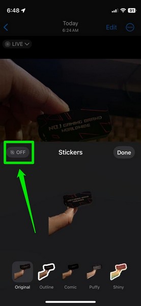Innym częstym powodem, dla którego możesz napotkać problem z niedziałającymi naklejkami na telefonie iPhone w systemie iOS 17, może być prosty błąd użytkownika. Kiedy tworzysz naklejkę na żywo przy użyciu zdjęcia na żywo w aplikacji Zdjęcia, animacja nie jest domyślnie aktywowana. Po dodaniu naklejki do listy musisz ręcznie włączyć przełącznik Na żywo, aby stała się naklejką aktywną.
