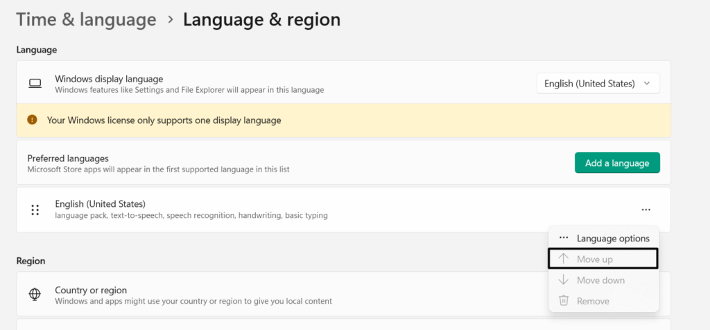 2.Na następnym ekranie wybierzJęzyk i regioni miejscejapońskina górze. Aby zrobić to samo, wystarczy przeciągnąć język na pierwsze miejsce za pomocą sześciu kropek po lewej stronie. W przeciwnym razie kliknijtrzy kropki (…)obok i wybierzPodnieśćdopóki nie zostanie umieszczony na górze.