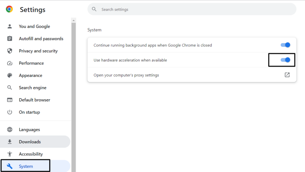 3.Na następnym ekranie, od lewej strony, wybierzSystemopcję i wyłącz poniższy przełącznik: