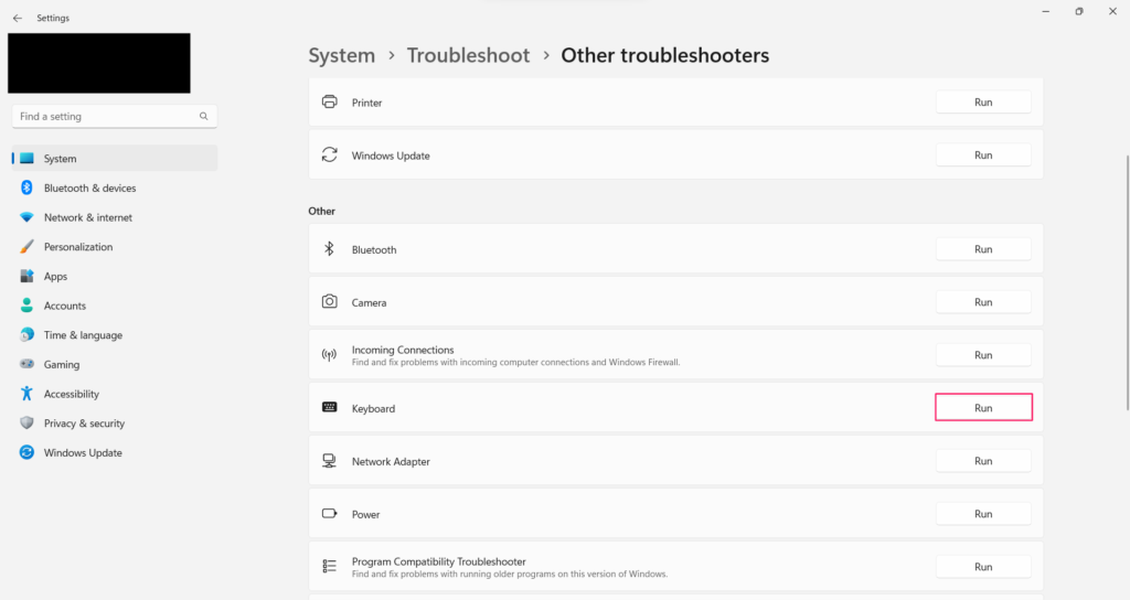 3.Na następnym ekranie kliknij przyciskUruchomićprzycisk obokKlawiaturanarzędzie do rozwiązywania problemów, aby je uruchomić.