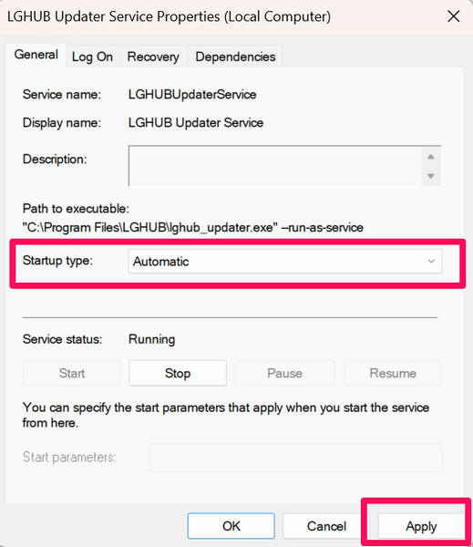 6. Upewnij się, że usługa aktualizacji LGHUB jest ustawiona na automatyczną