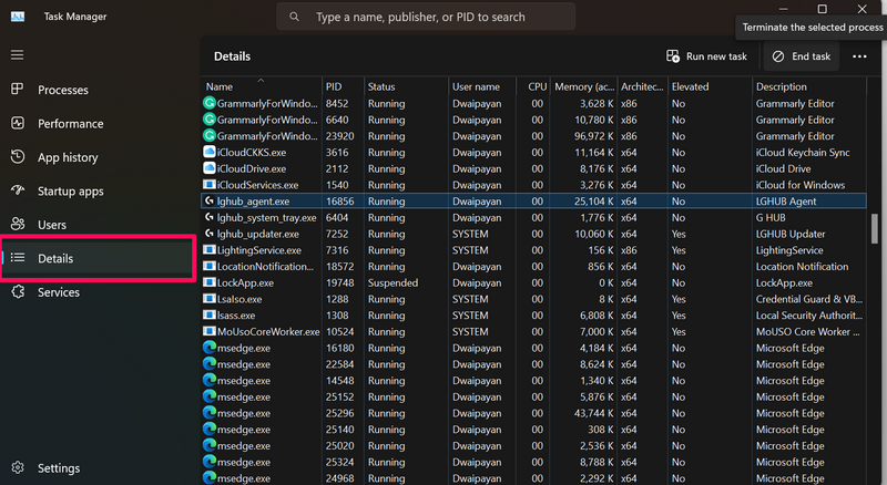3.Znajdź i wybierzlghub_agent.exe,lghub_system_tray.exe, Ilghub_updater.exeprocesy na liście i kończ je wszystkie jeden po drugim, używając przyciskuZakończ zadanieprzycisk.