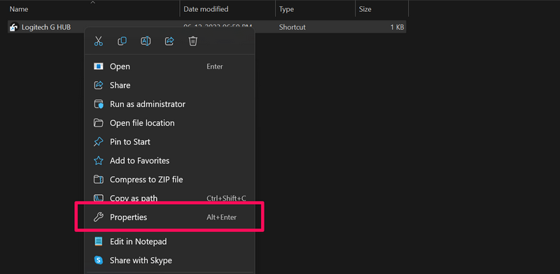 3.Teraz,kliknij prawym przyciskiem myszy skrót Logitech G Hubi wybierzWłaściwościopcję w menu kontekstowym.