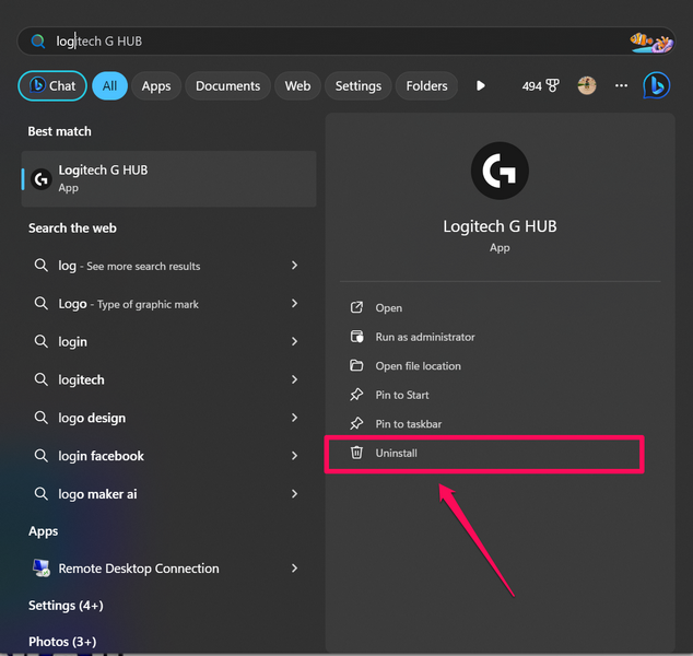 Teraz, jeśli wszystkie powyższe metody nie rozwiążą problemu niedziałającego Logitech G Hub na komputerze lub laptopie z systemem Windows 11, możesz teraz spróbować ponownie zainstalować program na swoim urządzeniu. W tym celu musisz odinstalować aplikację G Hub ze swojego komputera lub laptopa, a następnie zainstalować ją ponownie.