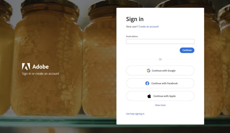3.Użyj swojej poczty e-mail, konta Google, konta na Facebooku lub konta Apple, abyzaloguj się na swoje konto Adobe.