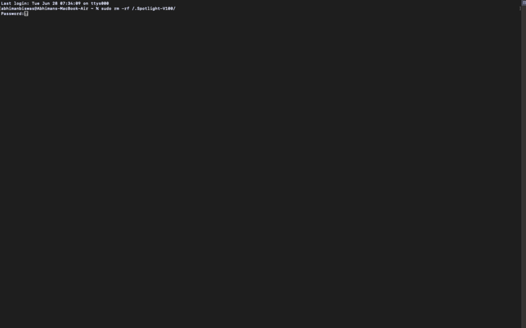 3.Teraz wprowadź polecenie –sudo rm -rf /.Spotlight-V100/i uderzyłWchodzić.