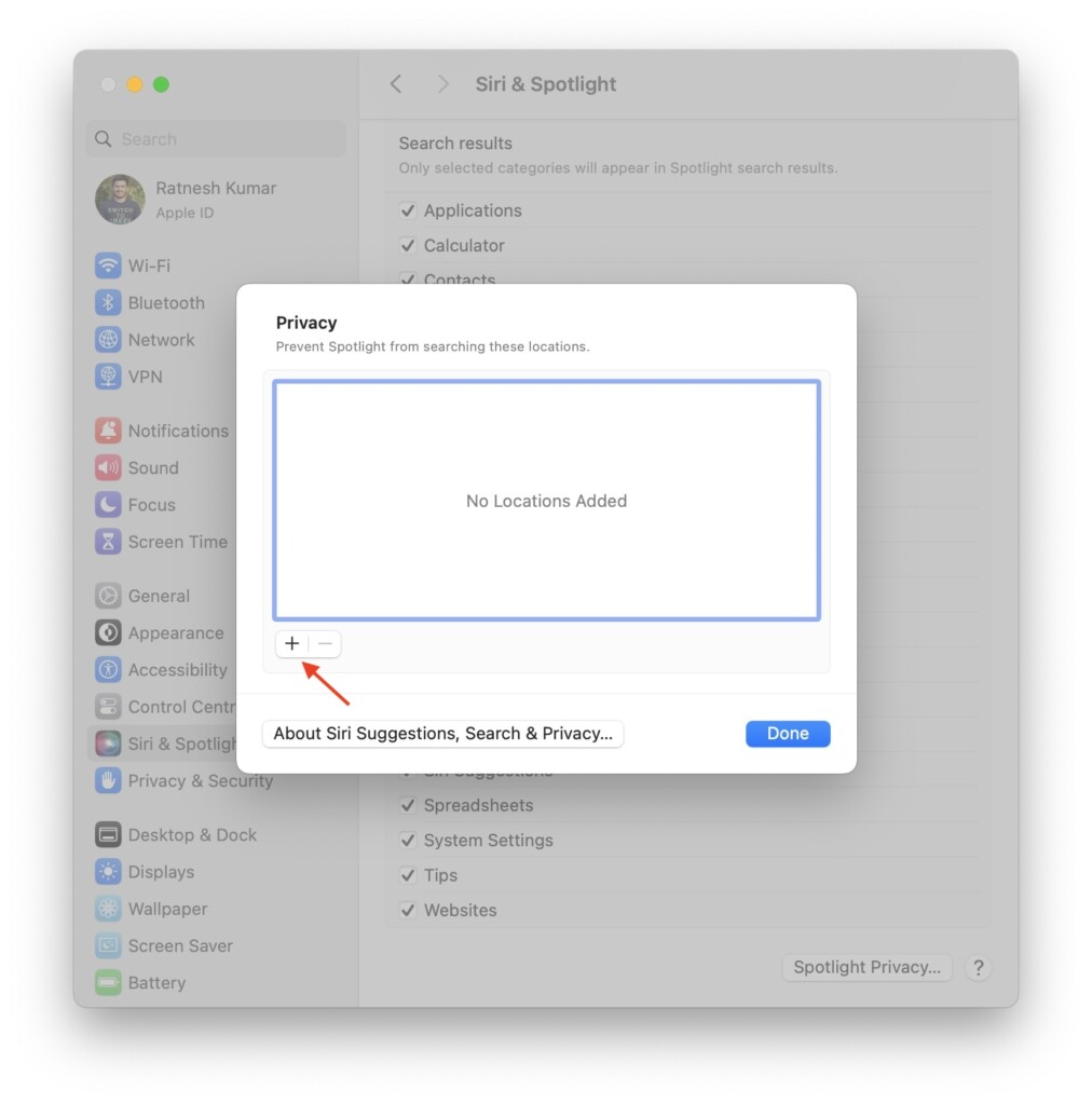 5.Teraz skorzystaj z+znak, aby dodać lokalizacje i foldery, których Spotlight ma unikać.