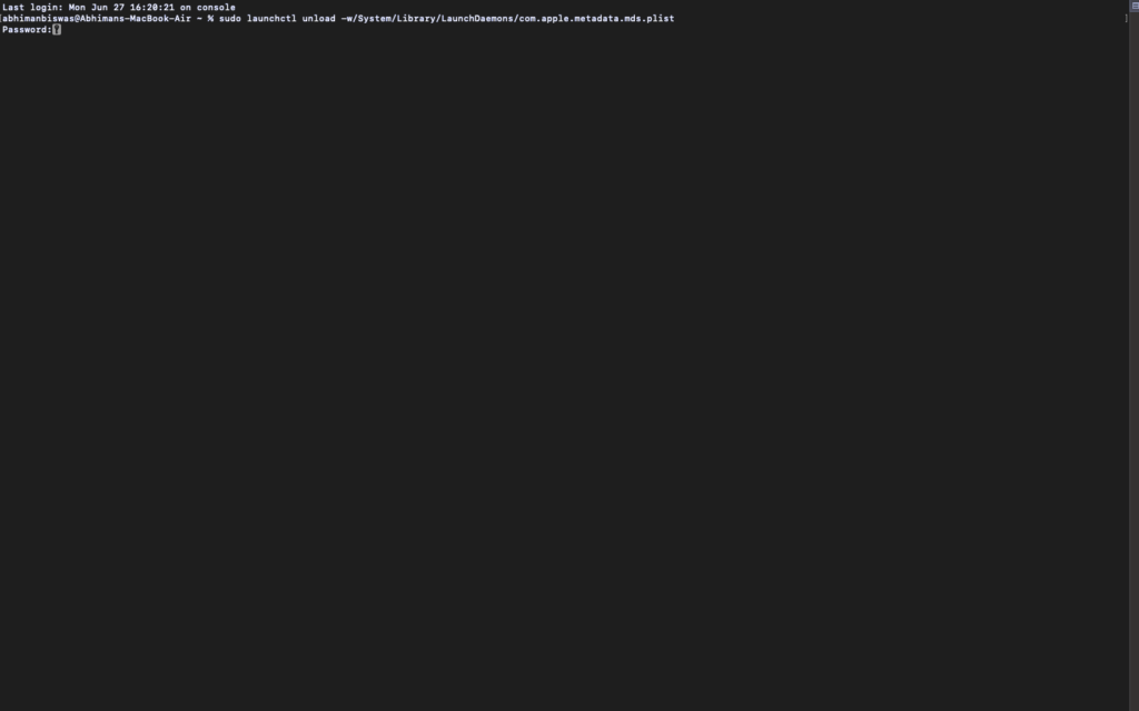 3.Teraz wprowadź polecenie –sudo launchctl unload -w/System/Library/LaunchDaemons/com.apple.metadata.mds.plisti uderzyłWchodzić.