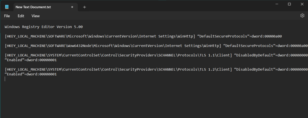 Windows Registry Editor Version 5.00[HKEY_LOCAL_MACHINESOFTWAREMicrosoftWindowsCurrentVersionInternet SettingsWinHttp] “DefaultSecureProtocols”=dword:00000a00[HKEY_LOCAL_MACHINESOFTWAREWow6432NodeMicrosoftWindowsCurrentVersionInternet SettingsWinHttp] “DefaultSecureProtocols”=dword:00000a00[HKEY_LOCAL_MACHINESYSTEMCurrentControlSetControlSecurityProvidersSCHANNELProtocolsTLS 1.1Client] “DisabledByDefault”=dword:00000000 “Enabled”=dword:00000001[HKEY_LOCAL_MACHINESYSTEMCurrentControlSetControlSecurityProvidersSCHANNELProtocolsTLS 1.2Client] “DisabledByDefault”=dword:00000000 “Enabled”=dword:00000001