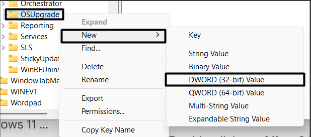 3.Kliknij prawym przyciskiem myszyAktualizacja systemu operacyjnegoklawisz po lewej stronie i wybierzNowy>Wartość DWORD (32-bitowa).opcja.