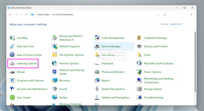 1.OtwórzPole wyszukiwania systemu Windowsza pomocąOkna + Sskrót klawiaturowy, wpiszOpcje indeksowaniaw nim i wybierz to samo z wyników wyszukiwania.