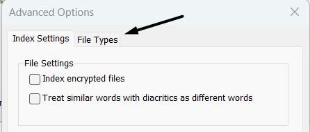 2.KliknijZaawansowanya następnie przejdź doTypy plikówaby przeglądać i edytować wszystkie formaty, które wyszukiwarka systemu Windows może indeksować.