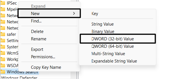 4.Kliknij prawym przyciskiem myszy nowyWyszukiwanie systemu Windowsklawisz i wybierzNowy > DWORD Wartośćopcja.