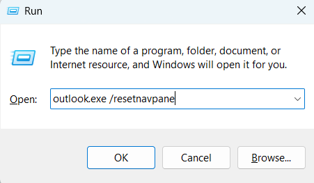 1.Skorzystaj zWindows + Rskrót, aby otworzyć plikUruchom narzędziei wpiszOutlook.exe /resetnavpanew polu wyszukiwania.