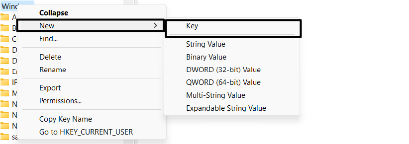 3.Kliknij prawym przyciskiem myszy określony klucz, wybierzNowy > Kluczopcję, a następnie nazwij nowy kluczWyszukiwanie systemu Windows.
