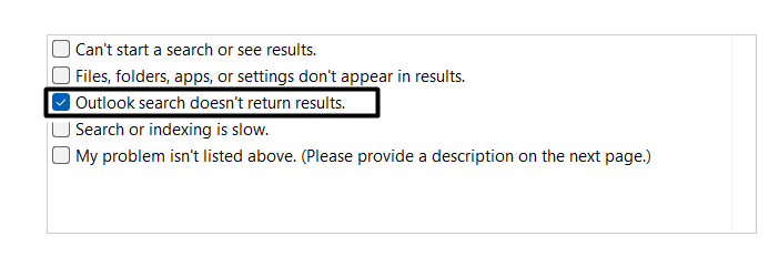 4.Następnie sprawdźWyszukiwanie w programie Outlook nie zwraca wynikówopcja naJaki problem zauważasz?podpowiedź.