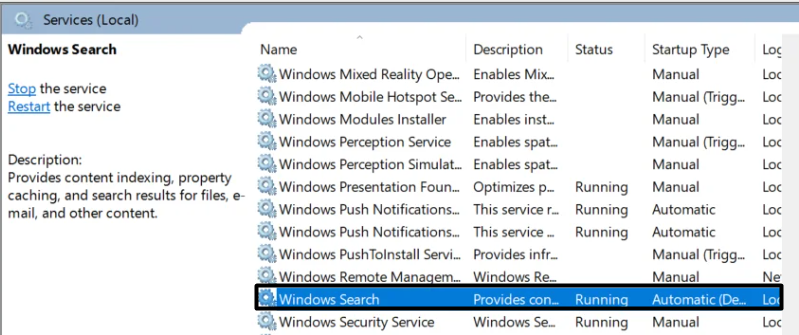 Inną możliwą przyczyną tego problemu z funkcją wyszukiwania programu Microsoft Outlook jestniedziałająca usługa wyszukiwania systemu Windows, co pomaga w prawidłowym działaniu wyszukiwarki. Może się zdarzyć, że wspomniana usługa nie działa poprawnie lub jest całkowicie wyłączona i dlatego pojawia się ten problem.
