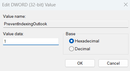 5.Teraz wpiszZapobiegaj indeksowaniu w programie OutlookwWartość DWORDpole, a następnie wybierzModyfikowaćz niego opcję.