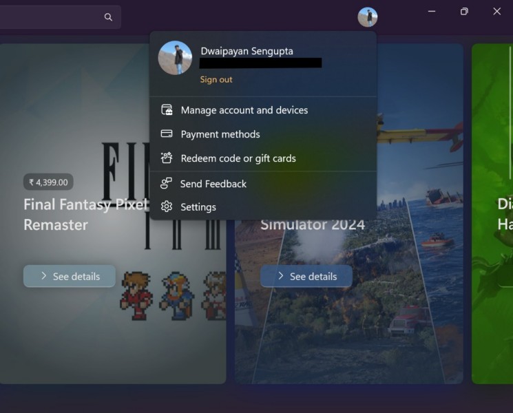 3. Sprawdź konto Microsoftza pomocą którego jesteś aktualnie zalogowany w sklepie Microsoft Store.