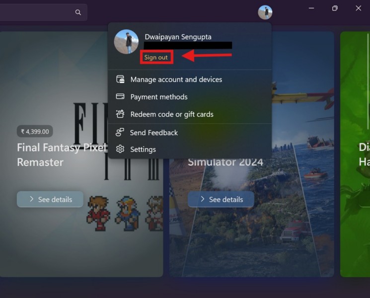 4.Jeśli nie odpowiada kontu Microsoft, za pomocą którego zakupiono aplikację lub grę, kliknij przyciskPrzycisk wylogowaniatuż pod nazwą konta.