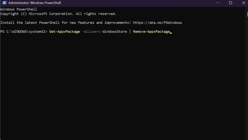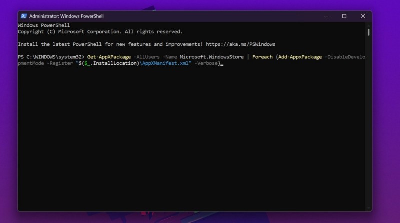 Po uruchomieniu ostatniego polecenia w PowerShell zamknij je i sprawdź, czy pojawia się błąd Microsoft Store 0x803f8001 w systemie Windows 11.