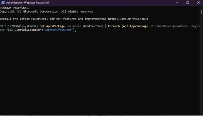 Po uruchomieniu obu poleceń zamknij okno PowerShell i sprawdź, czy na komputerze lub laptopie z systemem Windows 11 pojawia się błąd Microsoft Store 0x803f8001.