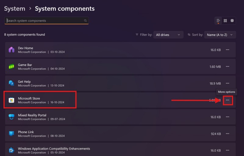 3.Na następnej stronie znajdź plikSklep Microsoftuna liście i kliknijWięcej opcji (…) przyciskobok.