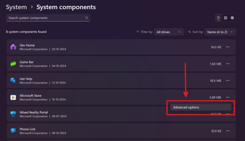 1. Wykonaj kroki 1-4 z poprzedniej sekcjiotworzyćStrona opcji zaawansowanychdlaAplikacja Microsoft Storew aplikacji Ustawienia na swoim urządzeniu.