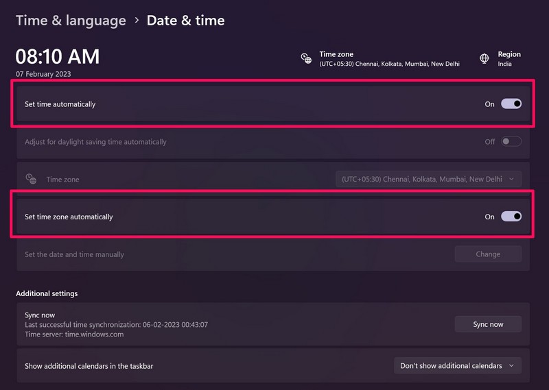 Innym powodem, który może wywołać błąd Microsoft Store 0x803f8001 na komputerze lub laptopie z systemem Windows 11, są źle skonfigurowane ustawienia daty i godziny. Ustawienia daty i godziny na komputerze stacjonarnym lub laptopie z systemem Windows 11 to jedne z najważniejszych elementów systemu Windows, dlatego jeśli nie zostaną zsynchronizowane zgodnie z bieżącym regionem na komputerze stacjonarnym lub laptopie z systemem Windows 11, mogą powodować błędy, takie jak błąd Microsoft Store 0x803f8001.