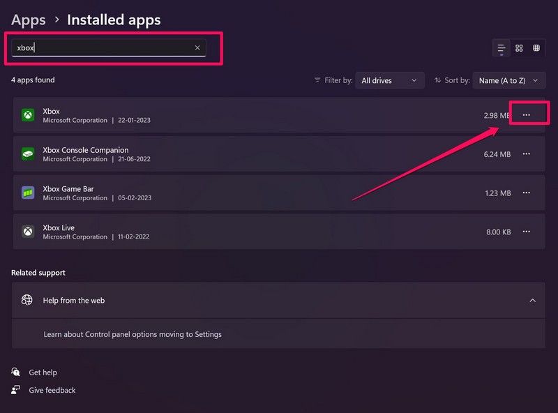 3. Skorzystaj z powyższego paska wyszukiwaniaDoznajdź aplikację Xboxlub dowolną inną aplikację, którą chcesz naprawić, i kliknijPrzycisk przepełnienia (...)za to.
