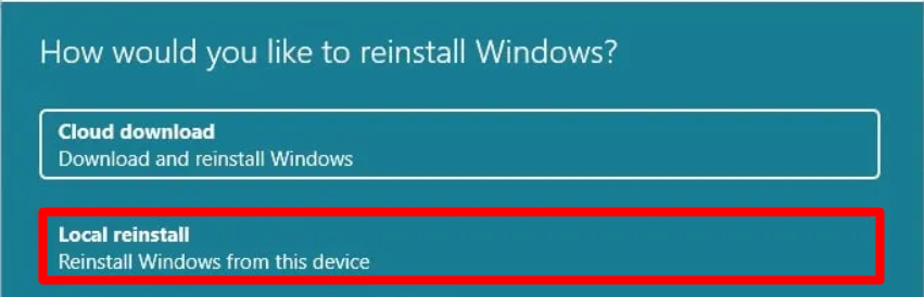 4.WybierzLokalna ponowna instalacjaopcję w następnym monicie, a następnie postępuj zgodnie z instrukcjami wyświetlanymi na ekranie.