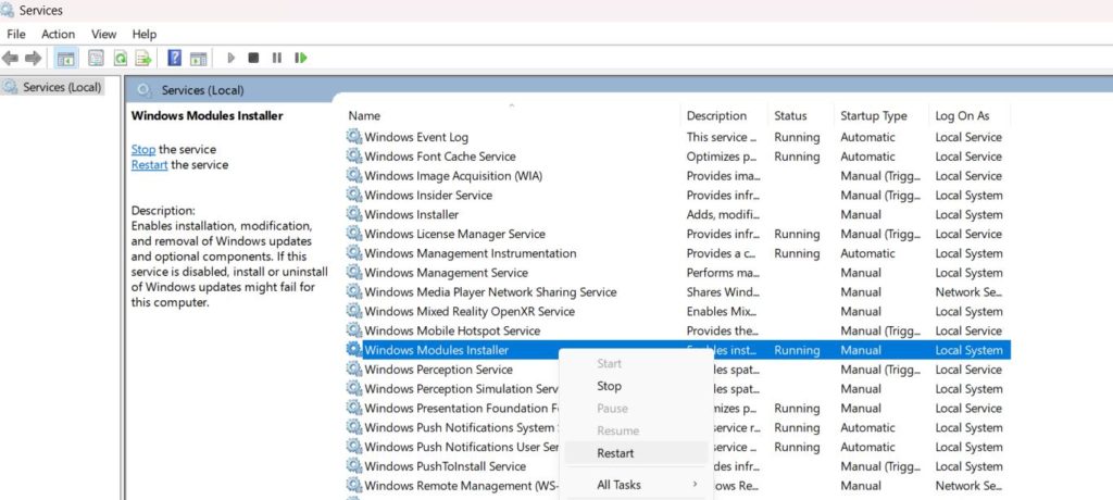 Rozwiązanie 3: Uruchom ponownie usługę instalatora modułów systemu Windows