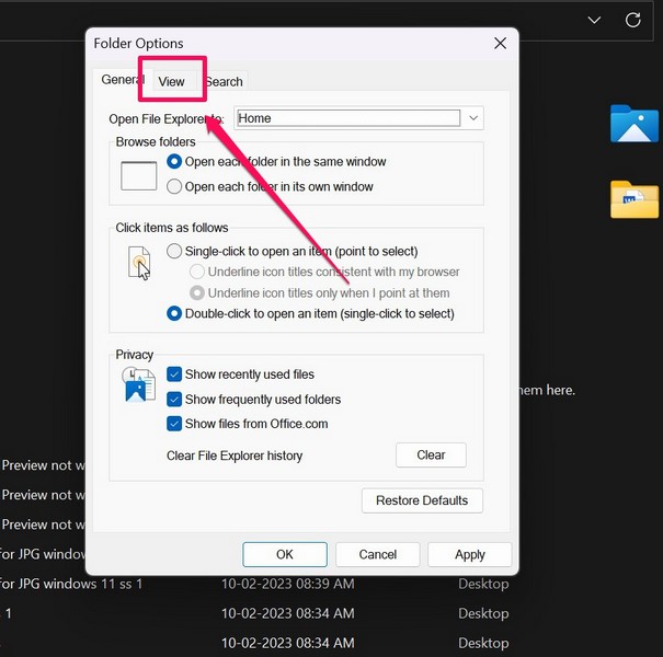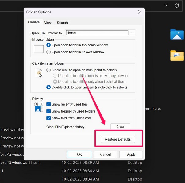 Kolejną poprawką, którą możesz spróbować, aby podgląd PNG działał ponownie na komputerze lub laptopie z systemem Windows 11, jest przywrócenie ustawień Eksploratora plików do wartości domyślnych. Oznacza to, że wszelkie zmiany ustawień Eksploratora plików, które wprowadziłeś, zostaną złagodzone i zostaną przywrócone do ustawień domyślnych. Aby przywrócić domyślne ustawienia Eksploratora plików w systemie Windows 11, wykonaj poniższe czynności: