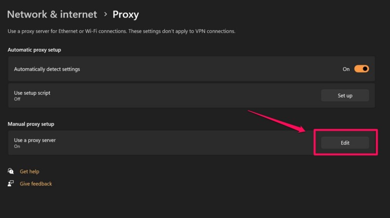 4.Następnie podSekcja ręczna konfiguracji proxy, kliknijPrzycisk edytujobokUżyj serwera proxyopcja.